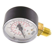 Das Druckmessgerät MW01050PV ist für gasförmige und flüssige Medien ausgelegt und misst Drücke im Bereich von 0 bis 10 bar. Das Messgerät hat zwei Messskalen in bar (schwarz) mit Skalenteilung von 0,5 und in psi (rot). Die Messgenauigkeitsklasse beträgt 2,5 (± 2,5 % maximale Abweichung). Der Messkörper besteht aus Kunststoff, Anschluss und Anzeige aus Messing. Bitte achten Sie darauf, dass Ihr Medium mit Messing kompatibel ist. Der Anschlusspunkt für dieses Manometer befindet sich unterhalb des Messgeräts. Als Faustregel gilt, dass Sie einen Druck wählen, dessen Nennwert mindestens 25% über dem maximalen Druck liegt.