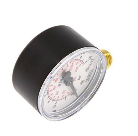 Das Druckmessgerät MW010050PV ist für gasförmige und flüssige Medien ausgelegt und misst Drücke im Bereich von 0 bis 100 bar. Das Messgerät hat zwei Messskalen in bar (schwarz) mit Skalenteilung von 5 und in psi (rot). Die Messgenauigkeitsklasse beträgt 2,5 (± 2,5 % maximale Abweichung). Der Messkörper besteht aus Kunststoff, Anschluss und Anzeige aus Messing. Bitte achten Sie darauf, dass Ihr Medium mit Messing kompatibel ist. Der Anschlusspunkt für dieses Manometer befindet sich unterhalb des Messgeräts. Als Faustregel gilt, dass Sie einen Druck wählen, dessen Nennwert mindestens 25% über dem maximalen Druck liegt.