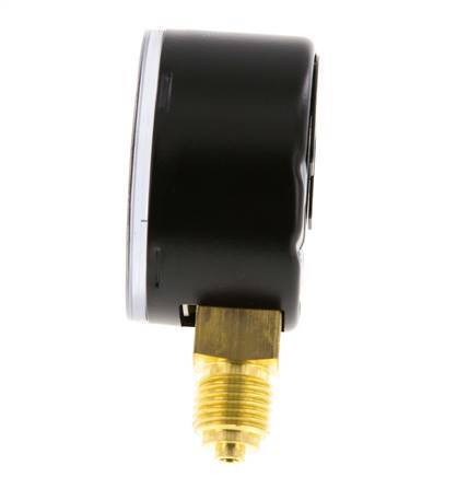 Druck Manometer MW0450SV hat einen Anschlusspunkt unterhalb des Manometers und misst Druck im Bereich von 0 bis 4 bar. Die Skaleneinteilung beträgt 0 - 0,2 und die Messgenauigkeitsklasse 1,6 (± 1,6 %). Das Stahlmanometergehäuse hat einen Durchmesser von 50 mm. Messsystem, Anzeige und G 1/4 Zoll Anschluss bestehen aus Messing.