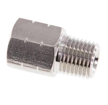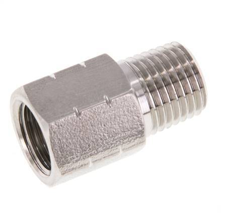 Dieser Reduziernippel aus rostfreiem Stahl ist mit Außen- und Innengewinde ausgestattet. Anschluss 1 hat ein 1/4-Zoll-NPT-Außengewinde. Anschluss 2 hat ein Innengewinde G 1/4 Zoll. Maximaler Druck von 40 bar (580 psi).
