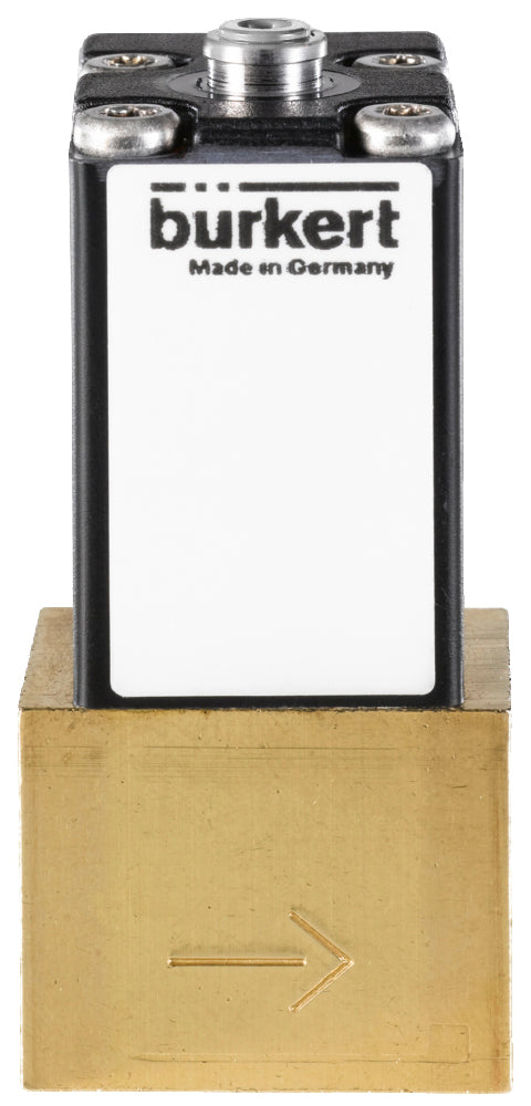 Burkert 2/2-Wege-Magnetventil (Typ 2871) mit 1/8 Zoll NPT-Gewinde und einer 24 V DC-Spule. Die Schaltfunktion des Magnetventils ist normal geschlossen (Spannung = offen). Das Ventil ist direkt betätigt, daher ist kein Differenzdruck erforderlich. Geeignet für maximale Medientemperaturen von 90 °C (194 °F) und einen Druckbereich von -1 bis 8 bar (-15 bis 116 psi). Gehäuse aus Messing mit FKM-Dichtung und einem Durchmesser von 1,2 mm. Der Kv-Wert beträgt 0,038 m3/h (0,63 l/min bei dp = 1 bar Wasser).