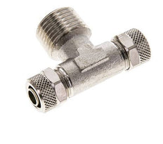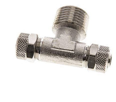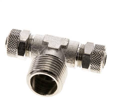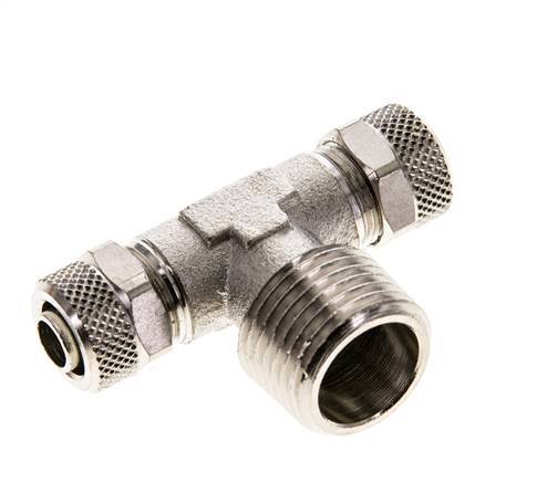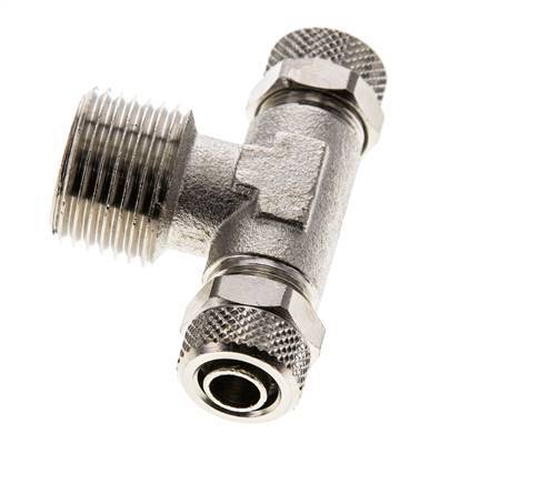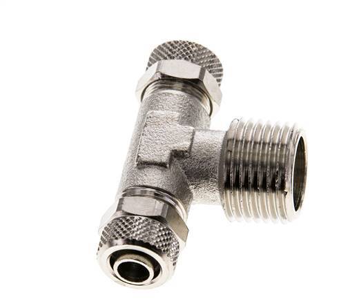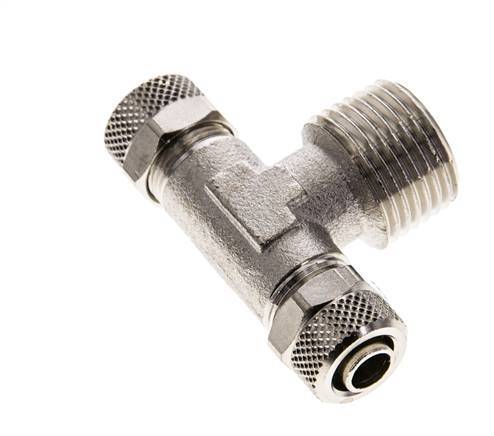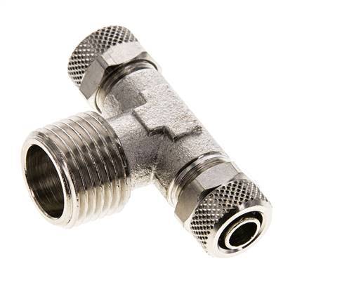Diese T-Stück-Steckverschraubung aus vernickeltem Messing ist mit zwei Steckanschlüssen und einem Außengewindeanschluss ausgestattet. Anschluss 1 ist