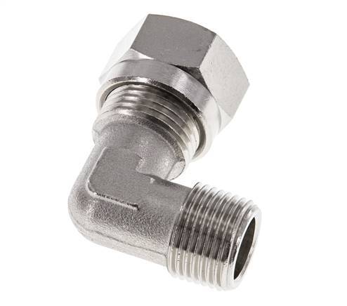 Dieser Winkelverschraubungsanschluss aus vernickeltem Messing verfügt über einen Anschluss mit Außengewinde und einen Anschluss für einen Schneidring. Anschluss 1 ist ein 12 mm Schneidring mit einer M18x1,5 Überwurfmutter. Anschluss 2 hat ein Außengewinde R 3/8 Zoll. Der maximale Druck beträgt 75 bar (1088 psi). Die Armatur ist für Temperaturen von -60 bis 300 °C (-76 bis 572 °F) geeignet. Es wird nach DIN EN ISO 8434-1 (DIN 2353) hergestellt.
