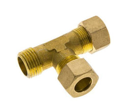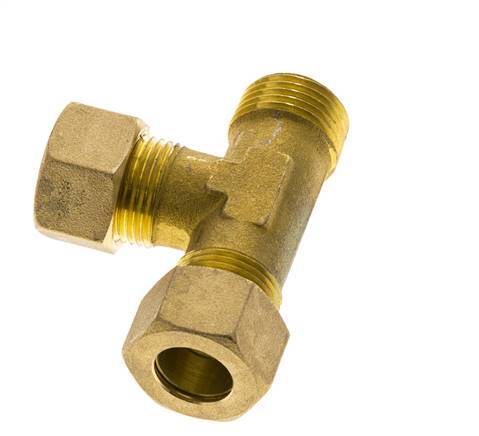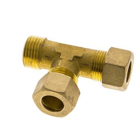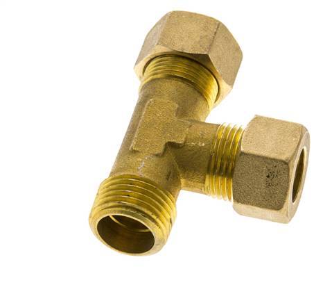 Dieses Messing-T-Stück zum Einschrauben ist mit einem Anschluss mit Außengewinde und zwei L-förmigen Anschlüssen mit Kompressionsring ausgestattet. Anschluss 1 ist ein 14-mm-Kompressionsring mit einer M20x1,5-Überwurfmutter. Anschluss 2 ist ein 14-mm-Kompressionsring mit einer M20x1,5-Überwurfmutter. Anschluss 3 hat ein R 1/2-Zoll-Außengewinde. Der Höchstdruck beträgt 89 bar (1291 psi). Die Armatur ist für Temperaturen von -60 bis 300 °C (-76 bis 572 °F) geeignet. Er ist nach DIN EN 1254-2 gefertigt.