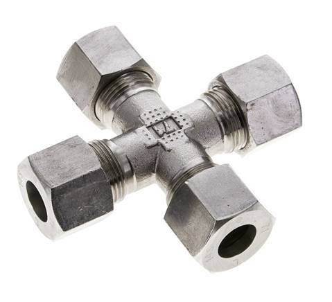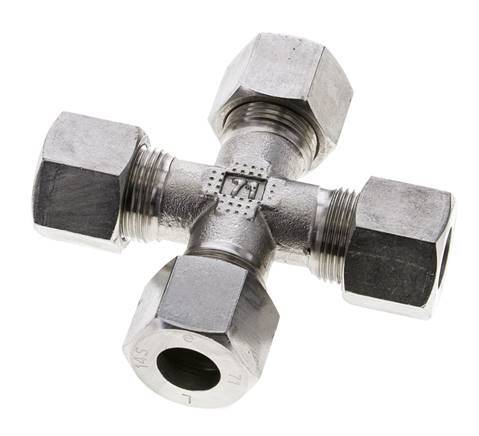 Diese Kreuzverschraubung aus Edelstahl ist mit vier kreuzförmig angeordneten Schneidringanschlüssen ausgestattet. Anschluss 1 ist ein 14 mm Schneidring. Anschluss 2 ist ein 14 mm Schneidring. Anschluss 3 ist ein 14 mm Schneidring. Anschluss 4 ist ein 14 mm Schneidring. Geeignet für Temperaturen von -60 °C bis 400 °C (-76 °F bis 752 °F). Maximaler Druck von 630 bar (9138 psi). Ausgelegt für die Belastungsklasse S (schwer). Es wird nach der DIN EN ISO 8434-1 (DIN 2353) hergestellt.