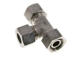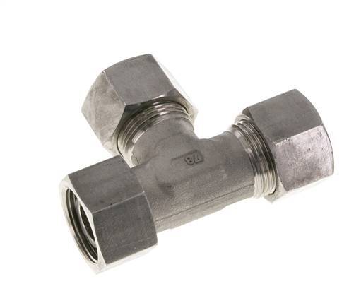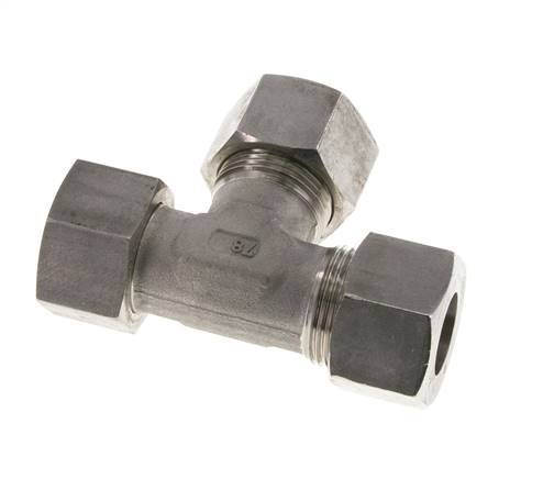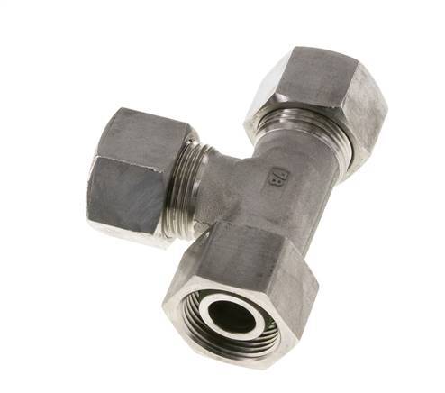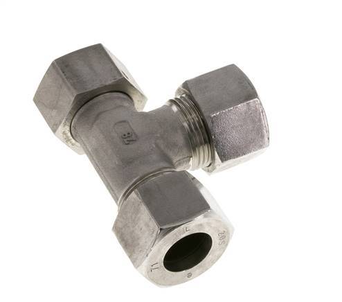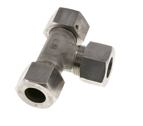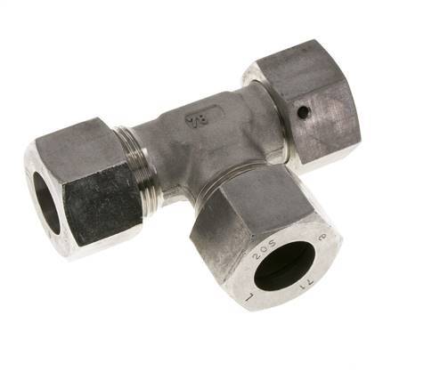 Diese T-Stück-Verschraubung aus Edelstahl 1.4571 ist mit Schneidring- und Drehrohranschlüssen ausgeführt. Er hat einen einstellbaren Anschluss. Anschluss 1 ist ein 20-mm-Schneidring mit einer Überwurfmutter M30x2. Anschluss 2 ist ein 20-mm-Schneidring mit einer Überwurfmutter M30x2. Anschluss 3 ist mit einem 20-mm-Drehrohranschluss versehen. Der Dichtungswerkstoff ist FKM. Der maximale Druck beträgt 400 bar (5800 psi). Die Armatur ist für Temperaturen von -20 bis 200 °C (-4 bis 392 °F) geeignet. Es wird nach DIN EN ISO 8434-1 (DIN 2353) hergestellt.