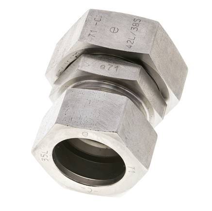 Dieser gerade Einschraubstutzen aus Edelstahl 1.4571 ist mit Schneidring- und Drehrohranschlüssen ausgeführt. Anschluss 1 ist ein 35-mm-Schneidring mit einer Überwurfmutter M45x2. Anschluss 2 hat einen 42-mm-Drehrohranschluss. Er hat einen O-Ring und einen Dichtungskonus zur Abdichtung. Der Dichtungswerkstoff ist FKM. Der maximale Druck beträgt 160 bar (2320 psi). Die Armatur ist für Temperaturen von -20 bis 200 °C (-4 bis 392 °F) geeignet. Es wird nach DIN EN ISO 8434-1 (DIN 2353) hergestellt.