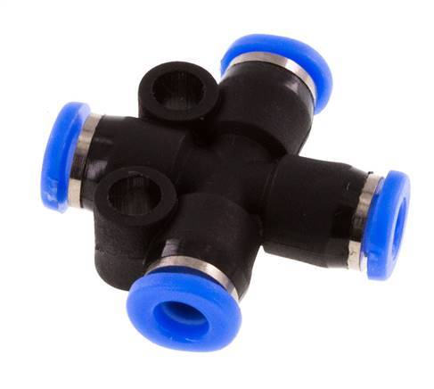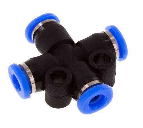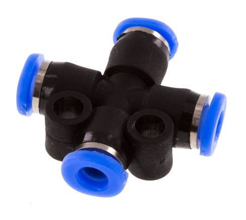 Dies ist eine Kreuzsteckverbindung mit 4 Anschlüssen. Steckanschlüsse sind ideal, um schnelle und zuverlässige Verbindungen für Pneumatikschläuche herzustellen. Alle Anschlüsse haben eine 3 mm Steckverbindung. Das Gehäuse ist aus PA 66 gefertigt. Die Anschlussstutzen sind aus PA 66 gefertigt. Der Dichtungswerkstoff ist NBR. Der Betriebsdruckbereich beträgt -0,95 bis 20 bar (-14 bis 290 psi) und ist somit für Vakuum geeignet. Die Armatur ist für Temperaturen von -20 bis 80 °C (-4 bis 176 °F) geeignet. Die Steckverschraubung lässt sich leicht installieren, indem man den Pneumatikschlauch bis zum Anschlag gegen den Entriegelungsring der Verschraubung drückt, und die innenliegende Kralle sichert sie. Er lässt sich leicht demontieren, indem der Entriegelungsring nach innen in Richtung des Anschlusses gedrückt und der Schlauch zurückgezogen wird.