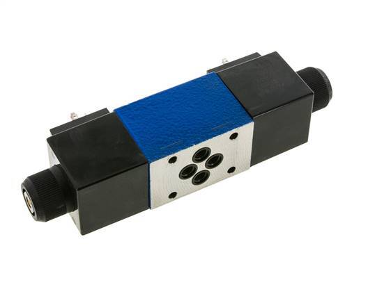 Bosch Rexroth direktwirkendes 4/3-Wege-Hydraulikmagnetventil mit NG6 (D03) Anbauschnittstelle (die Anbauschnittstelle NG 6 ist genormt nach DIN 24340-A6, ISO 4401-03, CETOP R 35 H-03 und NFPA-D03) und einer 230 V AC-Spule. Das Ventil hat ein Gusseisengehäuse mit NBR-Dichtung (Nitrilkautschuk). In der Ausgangsstellung ist der P-Anschluss gesperrt, der Durchfluss fließt von A und B nach T. Das Ventil ist für Systeme mit einem maximalen Druck von 350 bar (5075 Psi) und einem Betriebstemperaturbereich von -15 - 80 ° C (5 - 176 ° F) geeignet. Das Ventil hat eine Durchflussmenge von 60 l/min und eine maximal zulässige Viskosität von 500 cSt. Die NBR-Dichtung (Nitrilkautschuk) ist für Mineralöle geeignet. Die manuelle Überbrückungsfunktion kann verwendet werden, um das System bei Stromausfall zu betreiben. Die Handhilfsbetätigung kann bis zu 5-10 bar betrieben werden. Da das Ventil einen maximalen Betriebsdruck von 350 bar (5075 psi) aufweist, kann es für Hochdruckanwendungen eingesetzt werden. Das Ventil hat die Schutzart IP65.