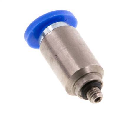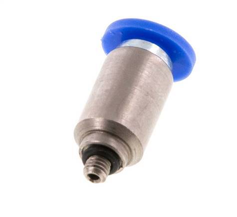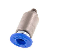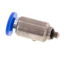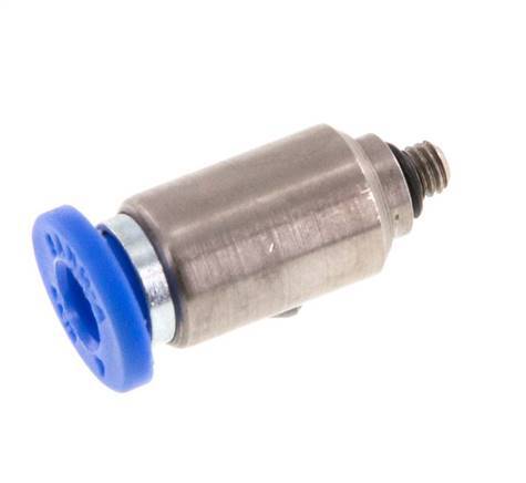 Dies ist eine gerade Steckverbindung mit 2 Anschlüssen. Steckanschlüsse sind ideal, um schnelle und zuverlässige Verbindungen für Pneumatikschläuche herzustellen. Anschluss 1 ist ein 4-mm-Steckanschluss. Der Anschluss 2 hat ein Außengewinde M 3. Der Außengewindeanschluss ist mit einem O-Ring abgedichtet. Das Gehäuse ist aus Messing gefertigt. Die Anschlussstutzen sind aus vernickeltem Messing und PA 66 gefertigt. Der Dichtungswerkstoff ist NBR. Der Betriebsdruckbereich beträgt -0,95 bis 20 bar (-14 bis 290 psi) und ist somit für Vakuum geeignet. Die Armatur ist für Temperaturen von -20 bis 80 °C (-4 bis 176 °F) geeignet. Die Steckverschraubung lässt sich leicht installieren, indem man den Pneumatikschlauch bis zum Anschlag gegen den Entriegelungsring der Verschraubung drückt, und die innenliegende Kralle sichert sie. Er lässt sich leicht demontieren, indem der Entriegelungsring nach innen in Richtung des Anschlusses gedrückt und der Schlauch zurückgezogen wird.