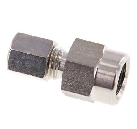 Diese gerade Verschraubung aus Edelstahl 1.4571 ist für die Verwendung mit Manometern ausgelegt. Anschluss 1 ist ein 6-mm-Kompressionsring mit einer M12x1,5-Überwurfmutter. Anschluss 2 hat ein Innengewinde G 1/4 Zoll. Der maximale Druck beträgt 315 bar (4568 psi). Die Armatur ist für Temperaturen von -60 bis 400 °C (-76 bis 752 °F) geeignet. Es wird nach DIN EN ISO 8434-1 (DIN 2353) hergestellt.