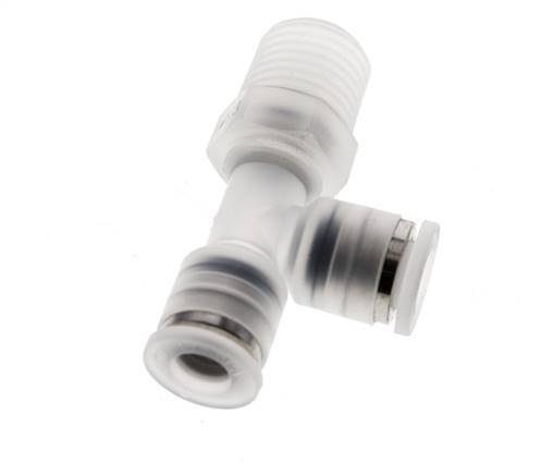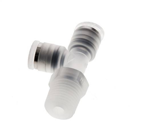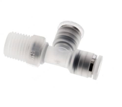 Dies ist ein rechtwinkliges T-Stück mit 3 Anschlüssen zum Einstecken. Steckanschlüsse sind ideal, um schnelle und zuverlässige Verbindungen für Pneumatikschläuche herzustellen. Anschluss 1 und 2 sind 6-mm-Steckanschlüsse und Anschluss 3 hat ein R 1/4-Zoll-Außengewinde. Der Korpus ist aus Polypropylen gefertigt. Die Anschlussstutzen sind aus Polypropylen gefertigt. Der Dichtungswerkstoff ist EPDM. Der Betriebsdruckbereich beträgt -0,95 bis 9 bar (-14 bis 131 psi) und ist somit für Vakuum geeignet. Die Armatur ist für Temperaturen von -20 bis 80 °C (-4 bis 176 °F) geeignet.