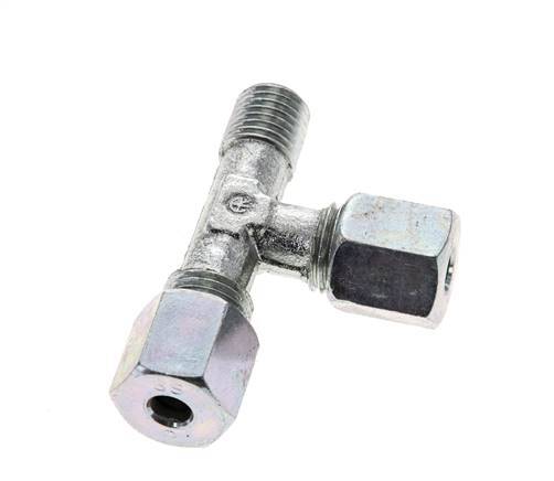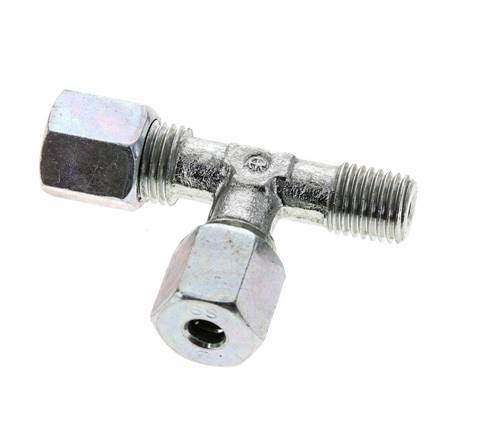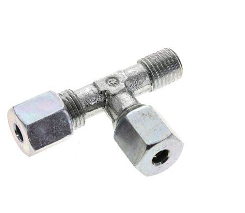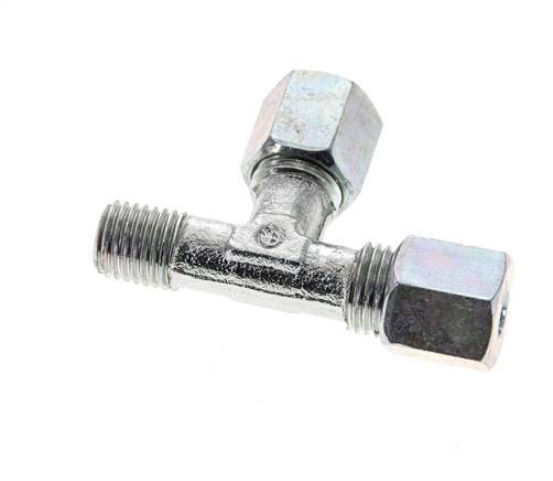 Diese T-Verschraubung aus verzinktem Stahl ist mit einem Außengewinde und zwei Schneidringanschlüssen in L-Form ausgeführt. Anschluss 1 ist ein 6 mm Schneidring mit einer M14x1,5 Überwurfmutter. Anschluss 2 ist ein 6 mm Schneidring mit einer M14x1,5 Überwurfmutter. Anschluss 3 hat ein Außengewinde M 12x1,5 (konisch). Der Höchstdruck beträgt 630 bar (9135 psi). Die Armatur ist für Temperaturen von -40 bis 120 °C (-40 bis 248 °F) geeignet. Es wird nach DIN EN ISO 8434-1 (DIN 2353) hergestellt.