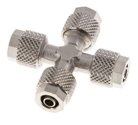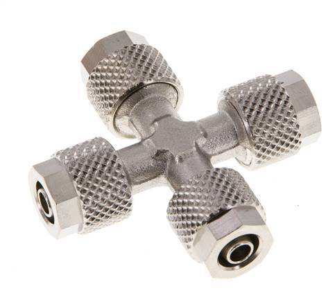 Diese Kreuzsteckverschraubung aus vernickeltem Messing ist mit vier Steckverbindungen ausgestattet. Alle Anschlüsse sind 6x4 mm Steckverbindungen. Der Betriebsdruck richtet sich nach den verwendeten Rohren oder Schläuchen.