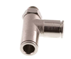 Dies ist ein rechtwinkliges T-Stück mit 3 Anschlüssen zum Einstecken. Steckanschlüsse sind ideal, um schnelle und zuverlässige Verbindungen für Pneumatikschläuche herzustellen. Anschluss 1 und 2 sind 8-mm-Steckanschlüsse und Anschluss 3 hat ein G 1/8-Zoll-Außengewinde. Der Außengewindeanschluss ist mit einem O-Ring abgedichtet. Das Gehäuse ist aus Messing gefertigt. Die Anschlussstutzen sind aus vernickeltem Messing gefertigt. Der Dichtungswerkstoff ist FKM. Der Betriebsdruckbereich beträgt -0,98 bis 16 bar (-14 bis 232 psi) und ist somit für Vakuum geeignet. Die Armatur ist für Temperaturen von -20 bis 150 °C (-4 bis 302 °F) geeignet. Die Steckverschraubung lässt sich leicht installieren, indem man den Pneumatikschlauch bis zum Anschlag gegen den Entriegelungsring der Verschraubung drückt, und die innenliegende Kralle sichert sie. Er lässt sich leicht demontieren, indem der Entriegelungsring nach innen in Richtung des Anschlusses gedrückt und der Schlauch zurückgezogen wird.