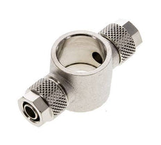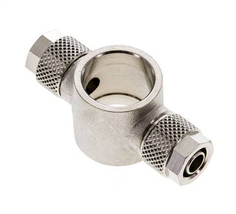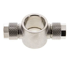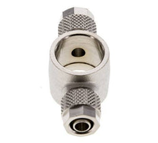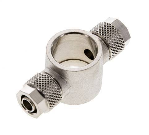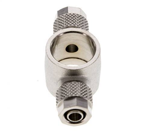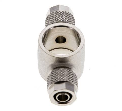 Dieses vernickelte Messing-Banjo-T-Stück zum Aufstecken ist mit zwei Steckanschlüssen und einem Hohlschraubenloch versehen. Anschluss 1 ist eine 8x6 m