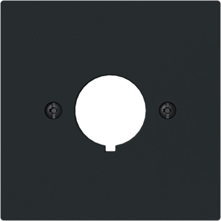 Schraubmontierte Mittelplatte mit Stützring, entworfen für industrielle Bedienelemente mit einer zentralen Befestigungsmutter von 22,5 mm Durchmesser. Verfügt über eine matte schwarze Oberfläche und dient als Abdeckung für industrielle Steuerkomponenten. Entwickelt für flächenbündige Montage ohne Befestigungszangen, was eine saubere professionelle Installation ermöglicht.