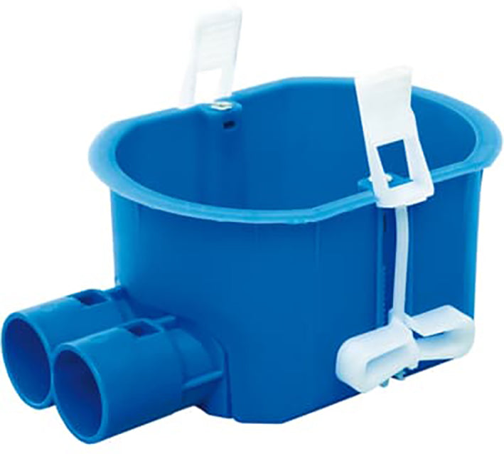 Professionelle Hohlwand-Junction Box mit einer Tiefe von 50mm, entworfen für die Installation von Doppelsteckdosen. Verfügt über doppelte Kabelanschlüsse (16/19mm) und Schnellbefestigungsbänder für eine werkzeugfreie Installation in Hohlwänden. Kompatibel mit verschiedenen Wandstärken und enthält eine Markierungsvorlage. Erfordert ein 76mm Bohrloch zur Befestigung.