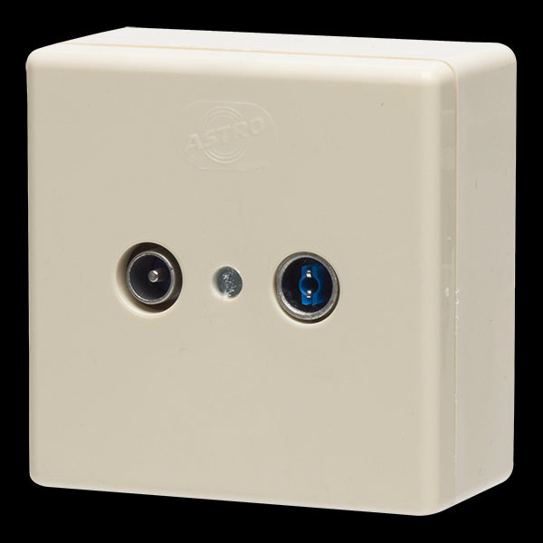 Astro Inhome Antennenanschlusskasten, cremeweiß, Anzahl/Typ der Ausgänge 2 Anschluss. Radio/TV, Aufputzmontage, Frequenz 5 - 1218MHz, geeignet für Kabelmodem, Anschluss für 2x IEC Stecker/Buchse, Anschlussdämpfung bei 860 MHz 0.6dB, Koaxkernverschraubung, 2 Ausgänge, Durchgangsdämpfung bei 860 MHz 0.6dB.