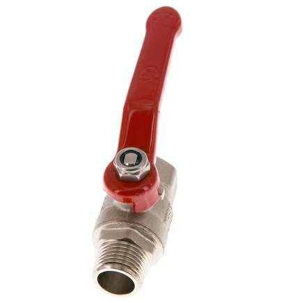 Kompakter 2-Wege-Kugelhahn PN 25 mit Anschlüssen R/Rp 1/2 Zoll mit Außengewinde und einem Griff zum Ein- und Ausschalten des Durchflusses. Die Ventilbohrung beträgt 14 mm und der maximale Druck 25 bar oder 363 psi. Geeignet für Druckluft, Wasser und Öle. Geeignet für Temperaturen von -20 bis 95 °C (-4 bis 203 °F). Gehäuse aus vernickeltem Messing, Kugel aus hartverchromtem Messing und Dichtungen aus PTFE/NBR.