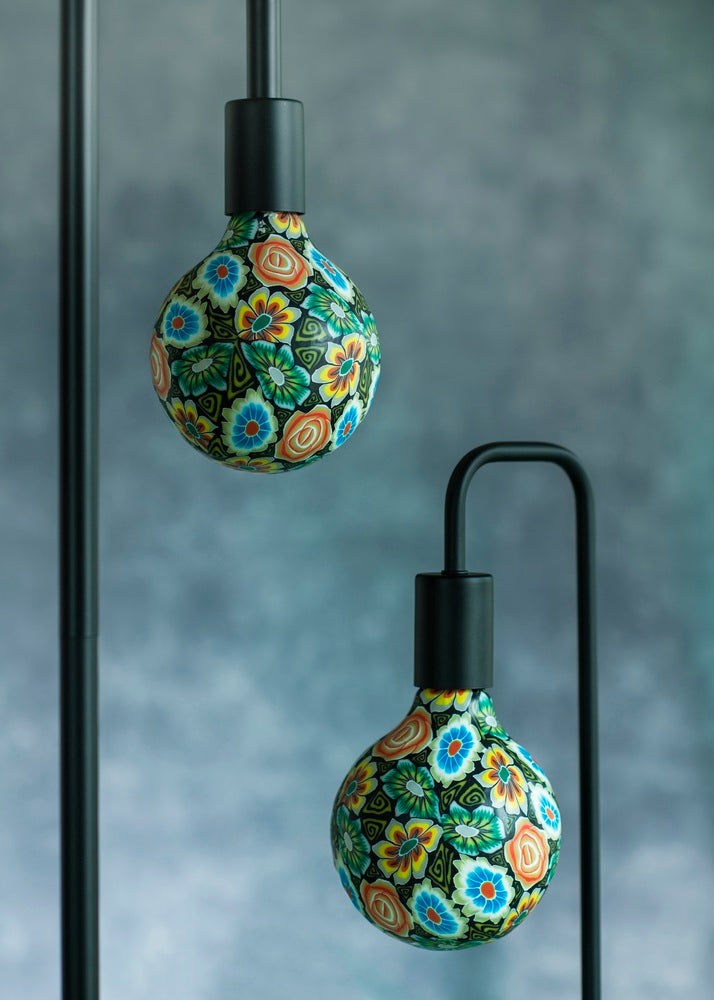 Künstlerische LED-Globuslampe mit einer bemalten Glasoberfläche und einem dunklen Blumenmuster. Diese E27 Retrofit-Glühbirne produziert 100 Lumen bei 1900K, arbeitet bei 230-240V mit 360° Lichtverteilung. Die dekorative Glühbirne mit den Maßen 125x175mm kombiniert Energieeffizienz mit zeitgenössischer Ästhetik und schafft eine visuelle Aussage, ob beleuchtet oder nicht.