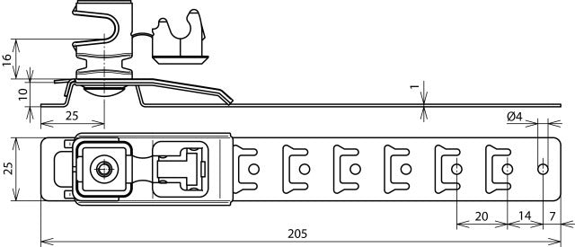 Der UNIsnap Dachleitungshalter ist mit einem zusätzlichen Klemmteil zur Befestigung von Fang- und Ableitungen auf Dächern, auch auf Schieferdächern, ausgestattet. Er besteht aus witterungsbeständigem Kunststoff, ist UV-stabilisiert und halogenfrei. Die Halterung besteht aus RVS 304 (V2A) Stahl mit einer Trägerlänge von 205mm und einem nominalen Leiterdurchmesser von 8mm. Sie verfügt über vorgestanzte Punkte zum Biegen und Einhängen in Dachziegel oder Dachlatten und hat eine lose Leitungsführung mit DEHNsnap Leitungshalter. Der Halter ist für schräge Dachflächen ausgelegt und hat eine Montagehöhe von 16 mm.