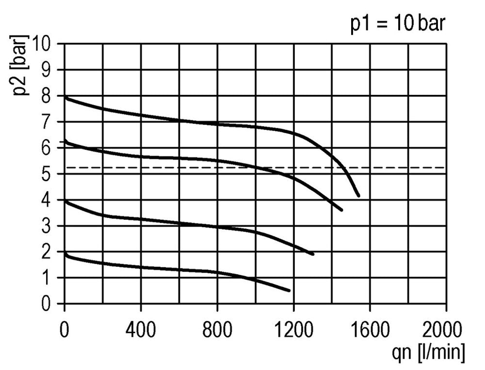 Der Druckregler regelt den Druck kontinuierlich auf ein stabiles Niveau, auch wenn der Eingangsdruck schwankt. Das Niveau kann zwischen 0,5 und 10,0 bar (7 bis 145 psi) eingestellt werden. Dieses Modell hat G 1/4 Zoll Anschlüsse. Die maximale Durchflussmenge beträgt 1000 l/min. Bitte beachten Sie, dass die maximale Durchflussmenge allein nicht ausreicht, um die richtige Dimensionierung vorzunehmen. Verwenden Sie die Durchflusskurve, um festzustellen, ob der Druckabfall innerhalb Ihres erwarteten Durchflussbereichs akzeptabel ist. Die Durchflusskurve zeigt die Durchflussmenge für einen bestimmten Eingangsdruck bei verschiedenen Ausgangsdrücken. Für jeden Ausgangsdruck ist ersichtlich, wie sich der Druck mit zunehmender Durchflussmenge verändert. Es wird empfohlen, das Gerät im flachen Bereich der Kurve zu verwenden und nicht am Anfang oder am Ende der Kurve. Beachten Sie, dass der Druckregler den Ausgangsdruck und nicht die Durchflussmenge regelt. Der Ausgangsdruck kann durch Hochziehen und Drehen des Handrads eingestellt werden.
