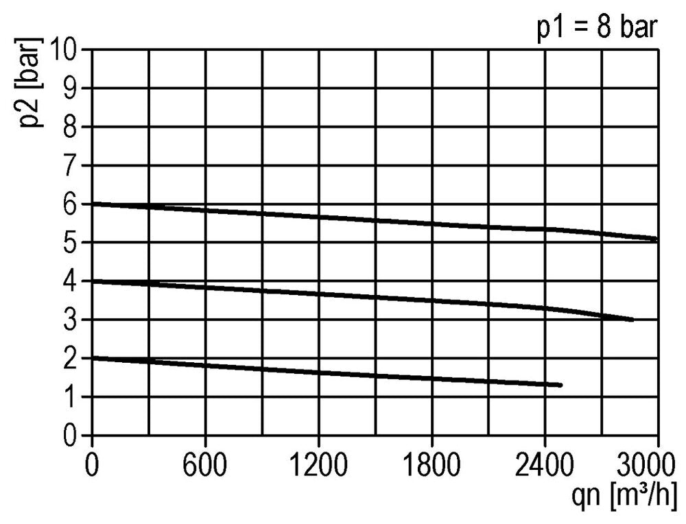 Der Druckregler regelt den Druck kontinuierlich auf ein stabiles Niveau, auch wenn der Eingangsdruck schwankt. Das Niveau kann zwischen 0,0 und 16,0 bar (0 bis 232 psi) eingestellt werden. Dieses Modell hat G 2-Zoll-Anschlüsse. Die maximale Durchflussmenge beträgt 50000 l/min. Bitte beachten Sie, dass die maximale Durchflussmenge allein nicht ausreicht, um die richtige Dimensionierung vorzunehmen. Verwenden Sie die Durchflusskurve, um festzustellen, ob der Druckabfall innerhalb Ihres erwarteten Durchflussbereichs akzeptabel ist. Die Durchflusskurve zeigt die Durchflussmenge für einen bestimmten Eingangsdruck bei verschiedenen Ausgangsdrücken. Für jeden Ausgangsdruck ist ersichtlich, wie sich der Druck mit zunehmender Durchflussmenge verändert. Es wird empfohlen, das Gerät im flachen Bereich der Kurve zu verwenden und nicht am Anfang oder am Ende der Kurve. Beachten Sie, dass der Druckregler den Ausgangsdruck und nicht die Durchflussmenge regelt.
