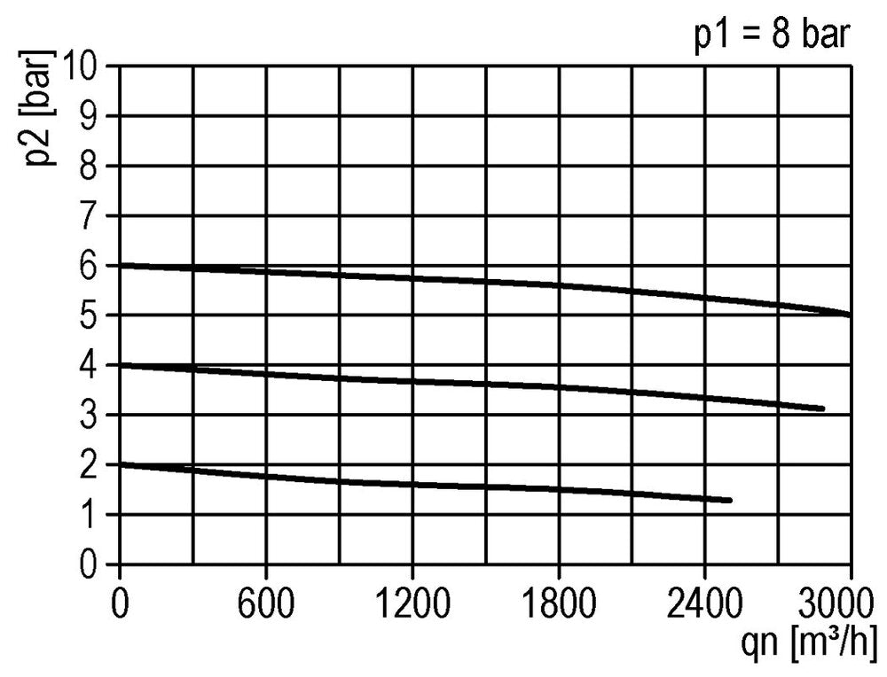 Der Druckregler regelt den Druck kontinuierlich auf ein stabiles Niveau, auch wenn der Eingangsdruck schwankt. Das Niveau kann zwischen 0,5 und 16,0 bar (7 bis 232 psi) eingestellt werden. Dieses Modell hat G 2-Zoll-Anschlüsse. Die maximale Durchflussmenge beträgt 50000 l/min. Bitte beachten Sie, dass die maximale Durchflussmenge allein nicht ausreicht, um die richtige Dimensionierung vorzunehmen. Verwenden Sie die Durchflusskurve, um festzustellen, ob der Druckabfall innerhalb Ihres erwarteten Durchflussbereichs akzeptabel ist. Die Durchflusskurve zeigt die Durchflussmenge für einen bestimmten Eingangsdruck bei verschiedenen Ausgangsdrücken. Für jeden Ausgangsdruck ist ersichtlich, wie sich der Druck mit zunehmender Durchflussmenge verändert. Es wird empfohlen, das Gerät im flachen Bereich der Kurve zu verwenden und nicht am Anfang oder am Ende der Kurve. Beachten Sie, dass der Druckregler den Ausgangsdruck und nicht die Durchflussmenge regelt. Der Ausgangsdruck kann durch Hochziehen und Drehen des Handrads eingestellt werden. Sie kann nach der Einstellung verriegelt werden, indem man das Handrad wieder hineindrückt.