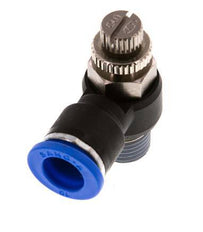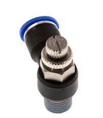 Dies ist ein vernickelter Messing/PA 66 Meter-Out-Krümmerschalldämpfer für die pneumatische Durchflussregelung in eine Richtung. Er hat auf der einen Seite einen 10-mm-Steckanschluss und auf der anderen Seite einen Anschluss mit R 1/4-Zoll-Außengewinde. Er verfügt über NBR-Dichtungen, die ihn für Anwendungen in einem Temperaturbereich von -20 bis 80 °C (-4 bis 176 °F) geeignet machen. Der Betriebsdruckbereich beträgt -0,95 bis 20 bar (-14 bis 290 psi) und ist somit für Vakuum geeignet. Verwenden Sie die drehbare Nadel, um die Öffnungsgröße einzustellen, die die Durchflussmenge in einer Richtung bestimmt.