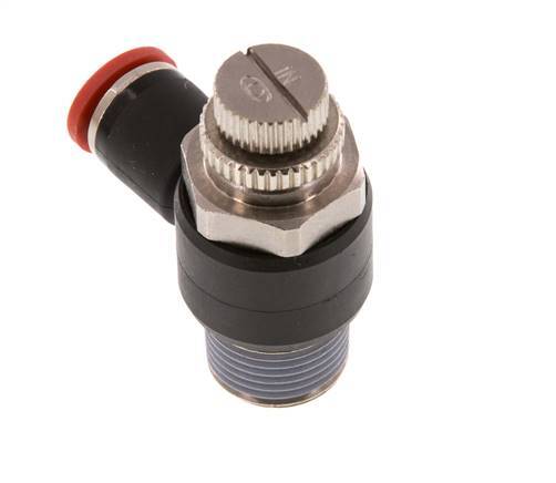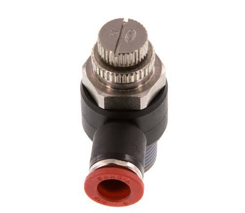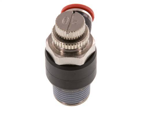 Dies ist ein vernickelter Messing/PA 66 Meter-in-Krümmer-Schalldämpfer für die pneumatische Durchflussregelung in eine Richtung mit einstellbarer Regelung des Luftstroms. Er hat auf der einen Seite einen 8-mm-Steckanschluss und auf der anderen Seite einen Anschluss mit R 3/8-Zoll-Außengewinde. Er verfügt über NBR-Dichtungen, die ihn für Anwendungen in einem Temperaturbereich von -20 bis 80 °C (-4 bis 176 °F) geeignet machen. Der Betriebsdruckbereich beträgt -0,95 bis 20 bar (-14 bis 290 psi) und ist somit für Vakuum geeignet. Verwenden Sie die drehbare Nadel, um die Öffnungsgröße einzustellen, die die Durchflussmenge in einer Richtung bestimmt.