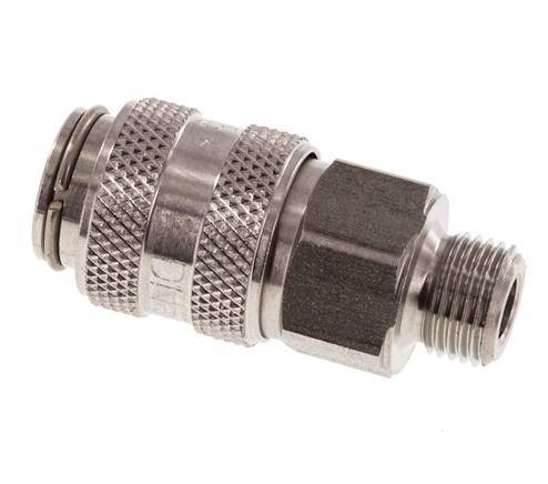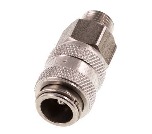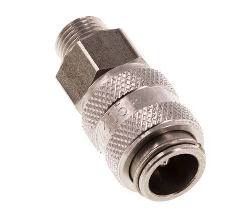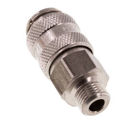 Luftkupplungsmuffe aus Edelstahl DN 5 mit G 1/8 Zoll Außengewinde. Eine pneumatische Kupplung wird verwendet, um Druckluftwerkzeuge schnell an eine Druckluftleitung anzuschließen. Die Kupplung besteht aus zwei Teilen: der Buchse (weiblicher Teil) und dem Stecker oder Nippel (männlicher Teil). Beim Abkuppeln schaltet sich die Kupplung automatisch ab, um den Leitungsdruck aufrechtzuerhalten.