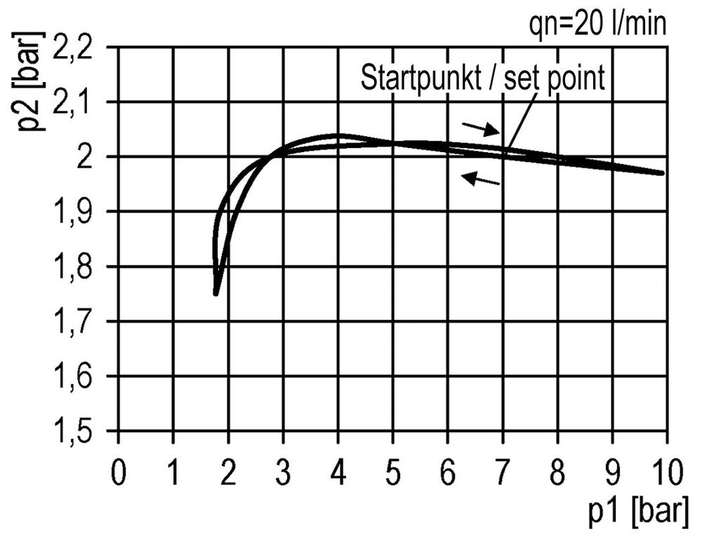 Dieser Filter-Regler-Schmierer (FRL) vereint drei Funktionen. Der Filter entfernt Wasser, Schmutz und andere schädliche Partikel, die größer als 5 Mikrometer sind. Der Druckregler regelt den Druck kontinuierlich auf ein stabiles Niveau, auch wenn der Eingangsdruck schwankt. Das Niveau kann zwischen 0,1 und 1,0 bar (1 bis 14 psi) eingestellt werden. Der Öler führt der pneumatischen Luft Öl zu, um die innere Reibung der pneumatischen Komponenten zu verringern. Die meisten modernen pneumatischen Geräte müssen nicht geschmiert werden; ein Öler sollte nur verwendet werden, wenn nachgeschaltete Geräte dies erfordern. Das empfohlene Schmieröl ist ISO-VG32-Turbinenöl. Dieses Modell hat G 1/2-Zoll-Anschlüsse. Die maximale Durchflussmenge beträgt 3500 l/min. Bitte beachten Sie, dass die maximale Durchflussmenge allein nicht ausreicht, um die richtige Dimensionierung vorzunehmen. Verwenden Sie die Durchflusskurve, um festzustellen, ob der Druckabfall innerhalb Ihres erwarteten Durchflussbereichs akzeptabel ist. Die Durchflusskurve zeigt die Durchflussmenge für einen bestimmten Eingangsdruck bei verschiedenen Ausgangsdrücken. Für jeden Ausgangsdruck ist ersichtlich, wie sich der Druck mit zunehmender Durchflussmenge verändert. Es wird empfohlen, das Gerät im flachen Bereich der Kurve zu verwenden und nicht am Anfang oder am Ende der Kurve. Beachten Sie, dass der Druckregler den Ausgangsdruck und nicht die Durchflussmenge regelt. Der Ausgangsdruck kann durch Hochziehen und Drehen des Handrads eingestellt werden. Sie kann nach der Einstellung verriegelt werden, indem man das Handrad wieder hineindrückt.
