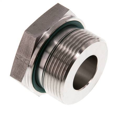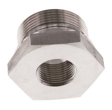 Diese Gewindereduzierung aus rostfreiem Stahl ist mit zylindrischen Außen- und Innengewinden ausgestattet. Anschluss 1 hat ein Außengewinde G 1 1/2 Zoll. Anschluss 2 hat ein Innengewinde G 3/4 Zoll. Die Dichtung ist aus Elastomer. Maximaler Druck von 315 bar (4569 psi).