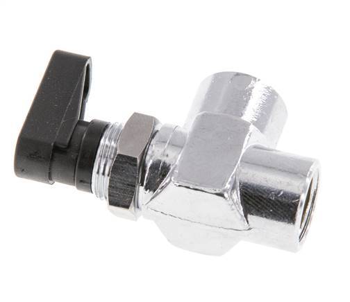Rechtwinkliger Kompaktkugelhahn aus Messing. Er hat G 1/4 Zoll Gewindeanschlüsse. Die Nennweite der Ventilbohrung beträgt 5 mm und der maximale Druck 20 bar oder 290 psi. Das Ventil ist geeignet für Wasser (kein Dampf), neutrale, gasförmige und nicht aggressive, flüssige Medien, Mineralöle, Druckluft und Vakuum (max. -0,99 bar oder -14 psi). Der Temperaturbereich reicht von -20 bis 80 °C -4 bis 176 °F. Gehäuse und Kugel aus verchromtem Messing und Dichtungen aus PTFE/NBR.
