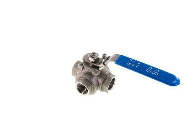 3-Wege T-Port Edelstahl-Kugelhahn mit G 1 Zoll Gewindeanschlüssen und einem Griff zur Steuerung der Flussrichtung. Der Durchmesser der Bohrung des Ventils beträgt 20 mm und der maximale Druck beträgt 63 bar oder 914 psi. Das Ventil ist geeignet für Wasser, Dampf, Öl, Druckluft, Kraftstoffe, Lösungsmittel und aggressive Medien. Der Temperaturbereich reicht von -20 bis 200 °C (-4 bis 392 °F). Edelstahlgehäuse, Edelstahlkugel und PTFE-Dichtungen. Druckeinlass ist an allen drei Anschlüssen möglich. Geeignet für elektrische und pneumatische Steuerung (ISO 5211 F05).