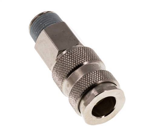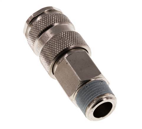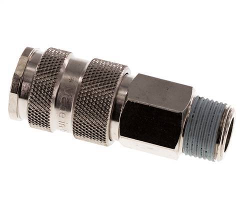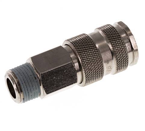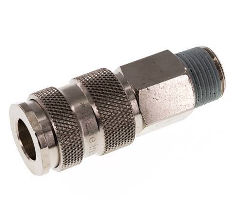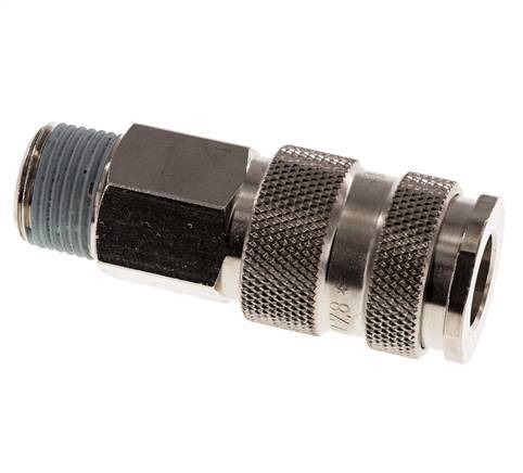 Luftkupplungsmuffe aus gehärtetem Stahl DN 7,8 mit R 3/8 Zoll Außengewinde. Eine pneumatische Kupplung wird verwendet, um Druckluftwerkzeuge schnell an eine Druckluftleitung anzuschließen. Die Kupplung besteht aus zwei Teilen: der Buchse (weiblicher Teil) und dem Stecker oder Nippel (männlicher Teil). Beim Abkuppeln schaltet sich die Kupplung automatisch ab, um den Leitungsdruck aufrechtzuerhalten.