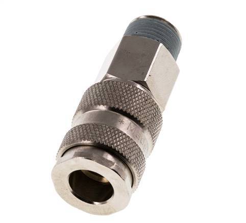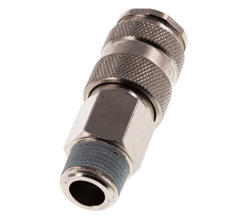 Luftkupplungsmuffe aus gehärtetem Stahl DN 7,8 mit R 3/8 Zoll Außengewinde. Der Betriebsdruckbereich reicht von -0,95 (vakuumtauglich) bis 35 bar. Die Steckdose ist für Temperaturen zwischen 20 und 100°C geeignet. Die Durchflussmenge beträgt 1850 l/min. Das Dichtungsmaterial ist NBR (Nitrilkautschuk).
