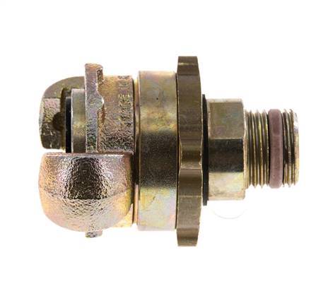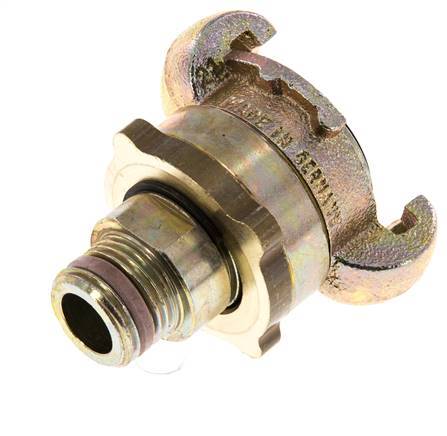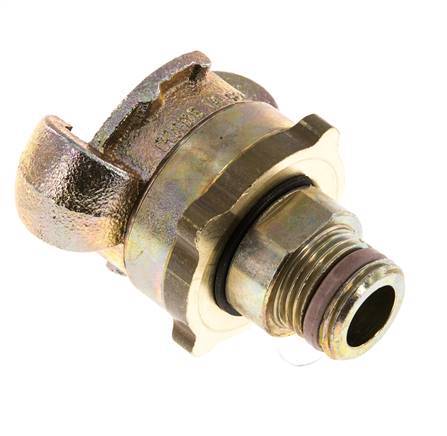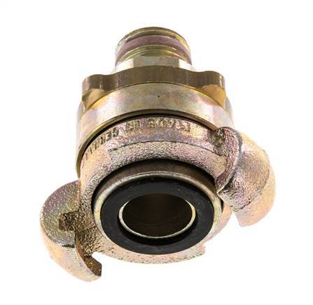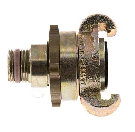 Diese Kompressorklauenkupplung aus Gusseisen nach DIN 3238 (42 mm Abstand zwischen den Klauen) hat ein G 1/2 Zoll Außengewinde. Sie entspricht der DIN 3238, da sie mit einem Sicherheitsring versehen ist, der nach dem Ankuppeln festgezogen wird, um ein versehentliches Entkuppeln zu verhindern. Sie wird in der Regel an eine Kompressorkupplung nach oder ähnlich der DIN 3498 angeschlossen, kann aber auch an eine andere Kupplung nach DIN 3238 angeschlossen werden. Er hat ein Gewinde, um ihn an einen Schlauch oder eine Armatur anzuschließen. Sie hat eine DN von 13 mm. Jede Kupplung hat zwei um 180 Grad versetzte Klauen und ist in der Regel mit einer anderen Klauenkupplung verbunden. Zum Verbinden ist eine Kraft erforderlich, die sie zusammenschiebt, und dann werden die Krallen in einem Winkel von 45 Grad zueinander gedreht, um die Verbindung zu sichern und eine Dichtung herzustellen. Er ist bis zu 16 bar in einem Temperaturbereich von -40 bis 95 °C geeignet. Er hat eine NBR-Dichtung (Nitrilkautschuk). Es hat einen galvanischen/elektrolytischen Oberflächenschutz aus Zink. Diese Kompressorkupplung wird in der Regel für anspruchsvolle Umgebungen und größere Luftströme verwendet, wobei sie dennoch eine schnelle Verbindungsmethode mit einer dichten Abdichtung bietet.