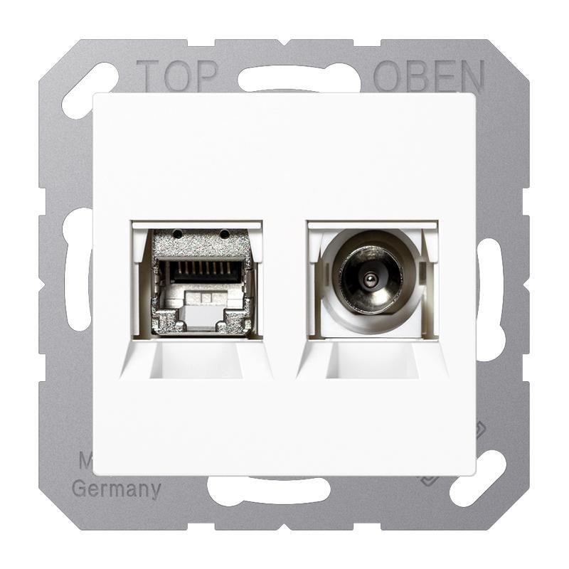 Diese Kommunikations-Wandsteckdose der Serie A/AS von Jung verfügt über einen RJ45-Anschlusspunkt Cat6a und einen Koax-Anschluss, um eine Netzwerkverbindung für Telefonie, Ethernet, IP oder Internetanwendungen herzustellen. Die Smart TV-Anschlussdose bildet eine auf den digitalen Fernsehzuschauer zugeschnittene Wandsteckdose. So sparen Sie mit dieser praktischen Smart TV-Anschlussdose Platz, Installationszeit und Verkabelung. Außerdem ist diese Kommunikationssteckdose der A/AS-Serie in alpinweißer Farbe gehalten.