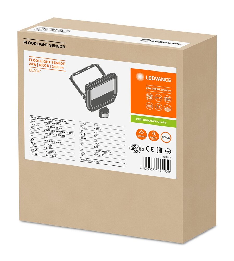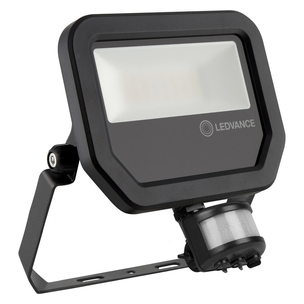 Ledvance Flutlicht Sensor Downlight/Spot/Spotlight, Unterkategorie Flutlicht, Lichtstrom 2400lm, effektiver Lichtstrom nach IEC 2400lm, Temperatur 4000K, Lichtfarbe weiß, geeignet für Lampenleistung 20W, Systemleistung 20W, Gehäuse schwarz, Schutzart (IP) IP65, mit Bewegungsmelder.