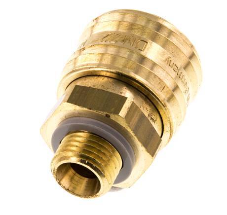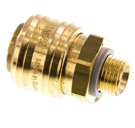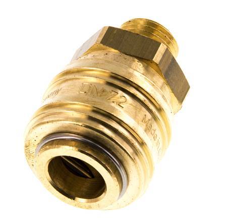 Luftkupplungsstutzen aus Messing DN 7,2 (Euro) mit G 1/4 Zoll Außengewinde. Eine pneumatische Kupplung wird verwendet, um Druckluftwerkzeuge schnell an eine Druckluftleitung anzuschließen. Die Kupplung besteht aus zwei Teilen: der Buchse (weiblicher Teil) und dem Stecker oder Nippel (männlicher Teil). Beim Abkuppeln schaltet sich die Kupplung automatisch ab, um den Leitungsdruck aufrechtzuerhalten.