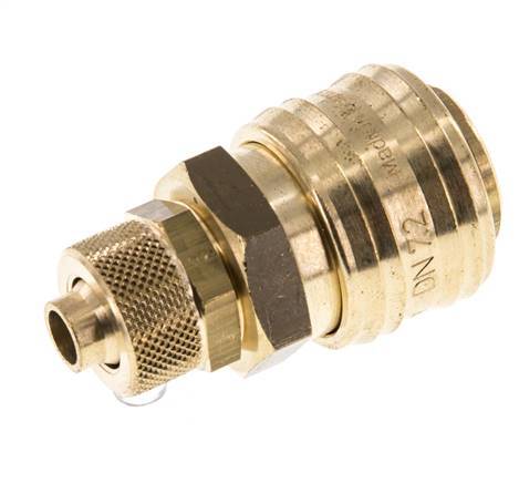 Luftanschlussstutzen aus Messing DN 7,2 (Euro) mit Überwurfmutter für 8x10 mm Schläuche. Eine pneumatische Kupplung wird verwendet, um Druckluftwerkzeuge schnell an eine Druckluftleitung anzuschließen. Die Kupplung besteht aus zwei Teilen: der Buchse (weiblicher Teil) und dem Stecker oder Nippel (männlicher Teil). Beim Abkuppeln schaltet sich die Kupplung automatisch ab, um den Leitungsdruck aufrechtzuerhalten.