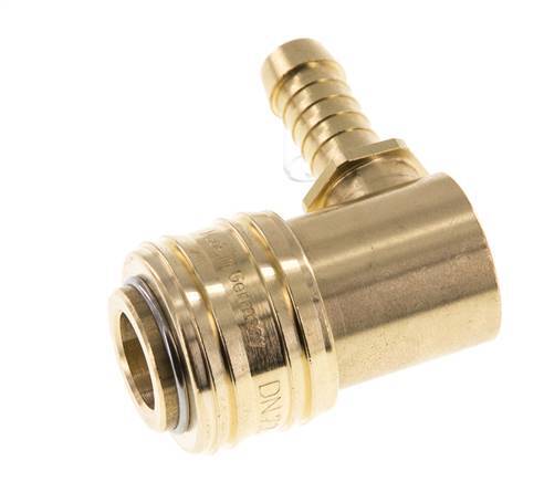 Luftkupplungsmuffe aus Messing DN 7,2 (Euro) mit einem 9-mm-Schlauchsäulenanschluss. Die Schlauchsäule steht in einem 90°-Winkel. Eine pneumatische Kupplung wird verwendet, um Druckluftwerkzeuge schnell an eine Druckluftleitung anzuschließen. Die Kupplung besteht aus zwei Teilen: der Buchse (weiblicher Teil) und dem Stecker oder Nippel (männlicher Teil). Beim Abkuppeln schaltet sich die Kupplung automatisch ab, um den Leitungsdruck aufrechtzuerhalten.