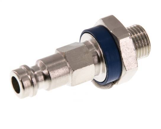 Luftkupplungsstecker aus vernickeltem Messing DN 5 mit blauer Farbkodierung und G 1/8 Zoll Außengewinde. Eine pneumatische Kupplung wird verwendet, um Druckluftwerkzeuge schnell an eine Druckluftleitung anzuschließen. Die Kupplung besteht aus zwei Teilen: der Buchse (weiblicher Teil) und dem Stecker oder Nippel (männlicher Teil). Beim Abkuppeln schaltet sich die Kupplung automatisch ab, um den Leitungsdruck aufrechtzuerhalten.