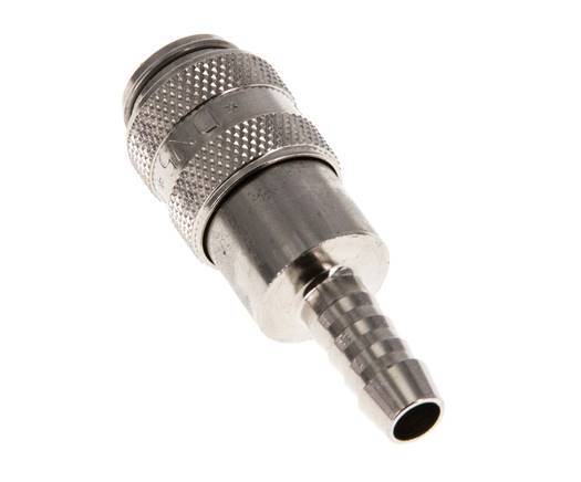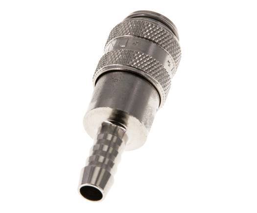 Luftkupplungsmuffe DN 5 aus vernickeltem Messing mit einem 6-mm-Schlauchsäulenanschluss. Eine pneumatische Kupplung wird verwendet, um Druckluftwerkzeuge schnell an eine Druckluftleitung anzuschließen. Die Kupplung besteht aus zwei Teilen: der Buchse (weiblicher Teil) und dem Stecker oder Nippel (männlicher Teil). Beim Abkuppeln schaltet sich die Kupplung automatisch ab, um den Leitungsdruck aufrechtzuerhalten.