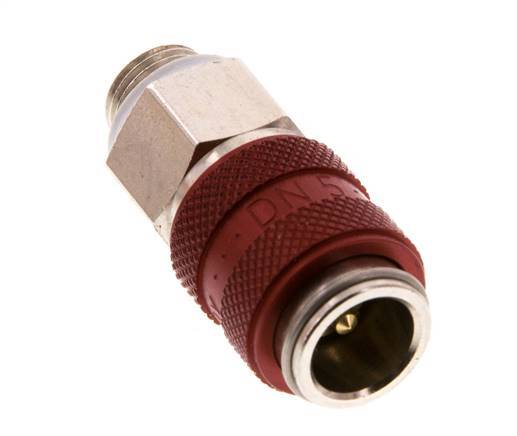 Das G 1/8-Zoll-Außengewinde ermöglicht das Aufschrauben auf ein passendes Teil mit Innengewinde. Diese Kupplung ist für Vakuumanwendungen geeignet. Die Steckdose hat eine beidseitige Absperrung. Sie können mit normalen Steckern und mit doppelseitig absperrenden Steckern verwendet werden. Wenn doppelseitige Absperrstopfen getrennt werden, sperren sie den Durchfluss in beide Richtungen ab. Der Betriebsdruckbereich beträgt -0,95 bis 35 bar. Die Steckdose ist für Temperaturen zwischen -20 und 100°C geeignet. Die Nenndurchflussmenge beträgt 360 l/min. Der Dichtungswerkstoff ist NBR (Nitrilkautschuk). Das Gehäuse aus vernickeltem Messing ist mit einem vernickelten Oberflächenschutz versehen. Es hat einen roten Streifen zur einfachen visuellen Identifizierung. Jede Farbe hat eine andere Form (achteckig, dreieckig, ...). Farbige Stecker können nur an Steckdosen mit der gleichen Farbe angeschlossen werden, sind aber auch mit nicht farbigen Steckdosen kompatibel. Das Farbsystem verhindert ein versehentliches Vertauschen verschiedener Medien oder Drücke.