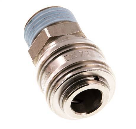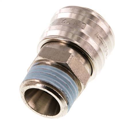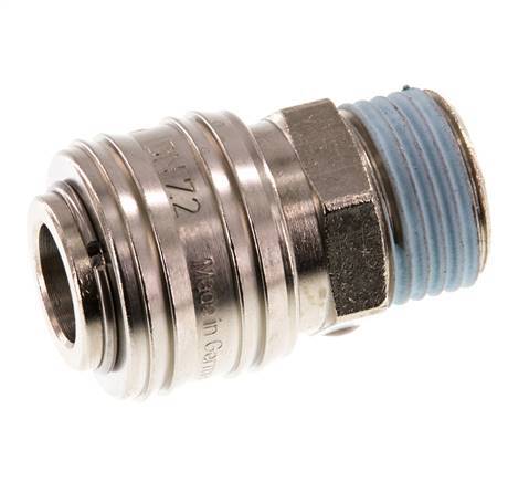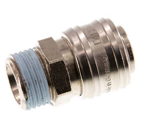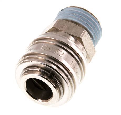 Luftkupplungsstutzen DN 7,2 (Euro) aus vernickeltem Messing mit G 1/2 Zoll Außengewinde. Eine pneumatische Kupplung wird verwendet, um Druckluftwerkzeuge schnell an eine Druckluftleitung anzuschließen. Die Kupplung besteht aus zwei Teilen: der Buchse (weiblicher Teil) und dem Stecker oder Nippel (männlicher Teil). Beim Abkuppeln schaltet sich die Kupplung automatisch ab, um den Leitungsdruck aufrechtzuerhalten.