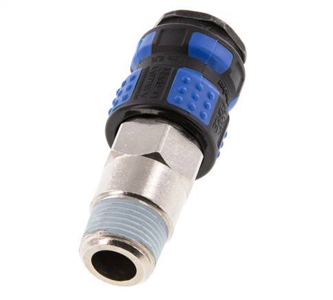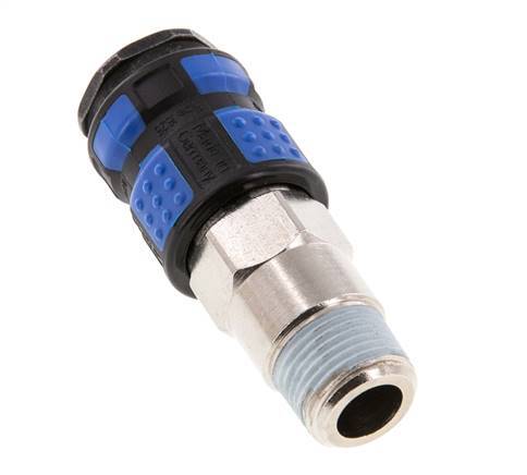 Luftkupplungsmuffe DN 7,8 aus vernickeltem Messing mit R 3/8 Zoll Außengewinde. Eine pneumatische Kupplung wird verwendet, um Druckluftwerkzeuge schnell an eine Druckluftleitung anzuschließen. Die Kupplung besteht aus zwei Teilen: der Buchse (weiblicher Teil) und dem Stecker oder Nippel (männlicher Teil). Beim Abkuppeln schaltet sich die Kupplung automatisch ab, um den Leitungsdruck aufrechtzuerhalten.