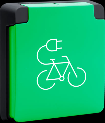 Spritzwassergeschützte Fahrradladestation 16 A/250 Vac mit Schutzleiter, Kindersicherung und mit Steckklemmen, ohne Aufputzdose. Die Steckdose ist vollständig durch eine nach oben klappbare Schutzabdeckung abgedeckt. Farbe: grün/schwarz.